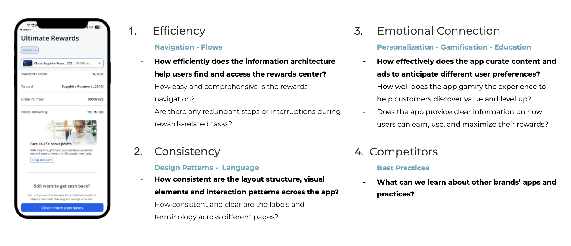 During our heuristic analysis, we evaluated the mobile experience of our client and other competitive or comparative experiences holistically for efficiency, consistency, and emotional connection.